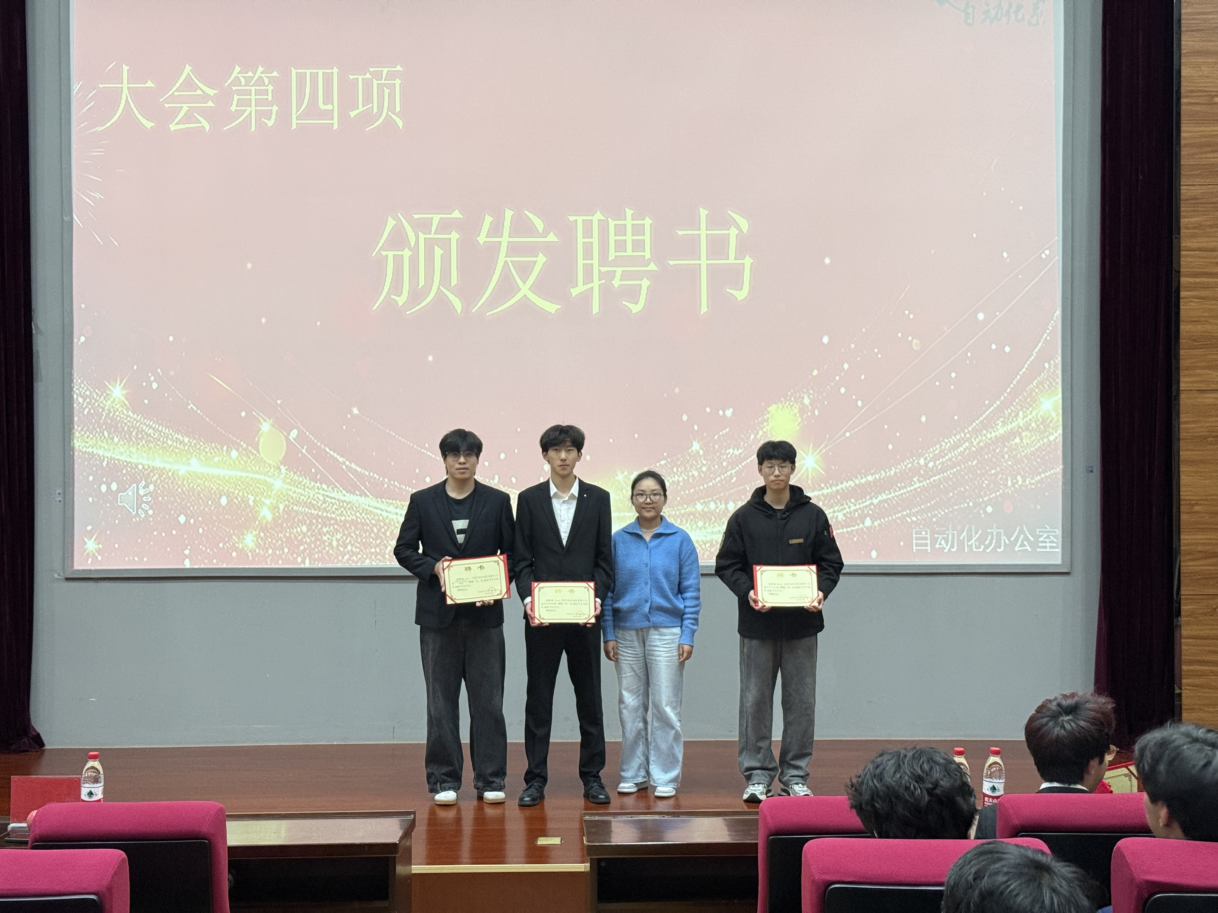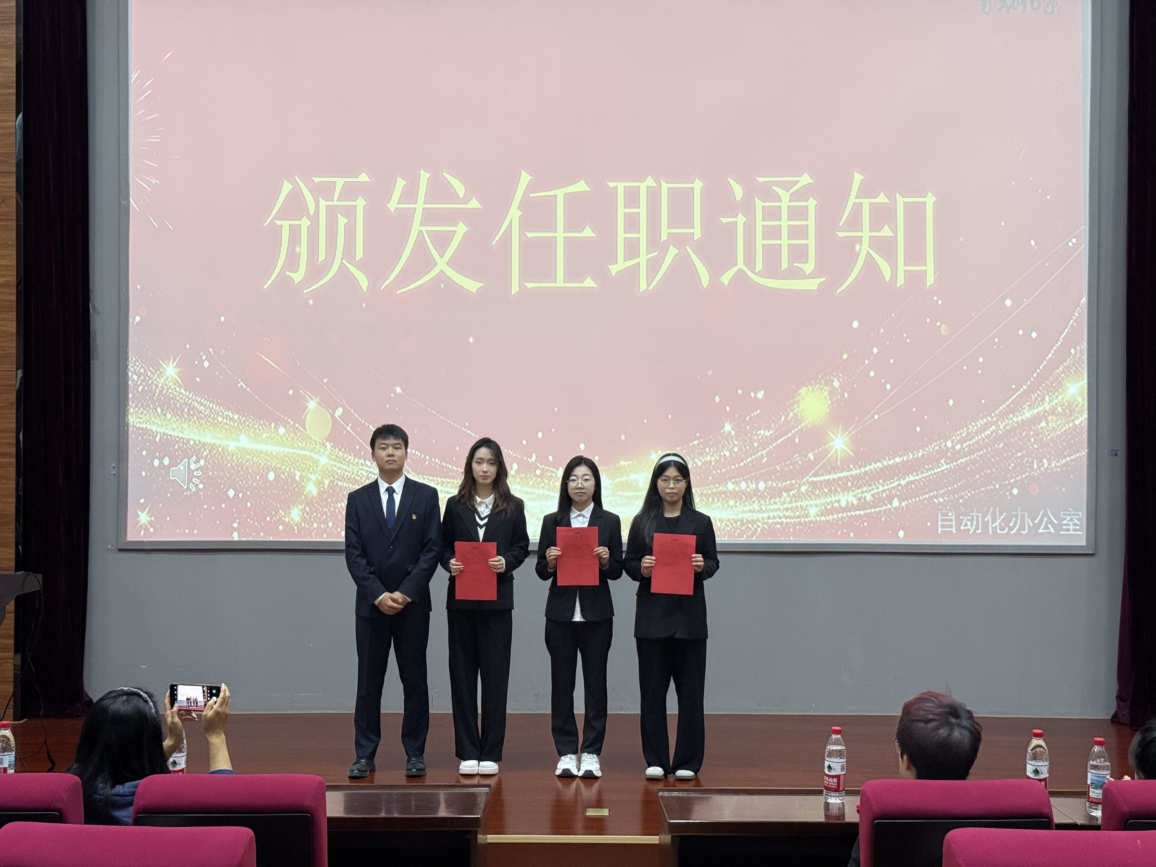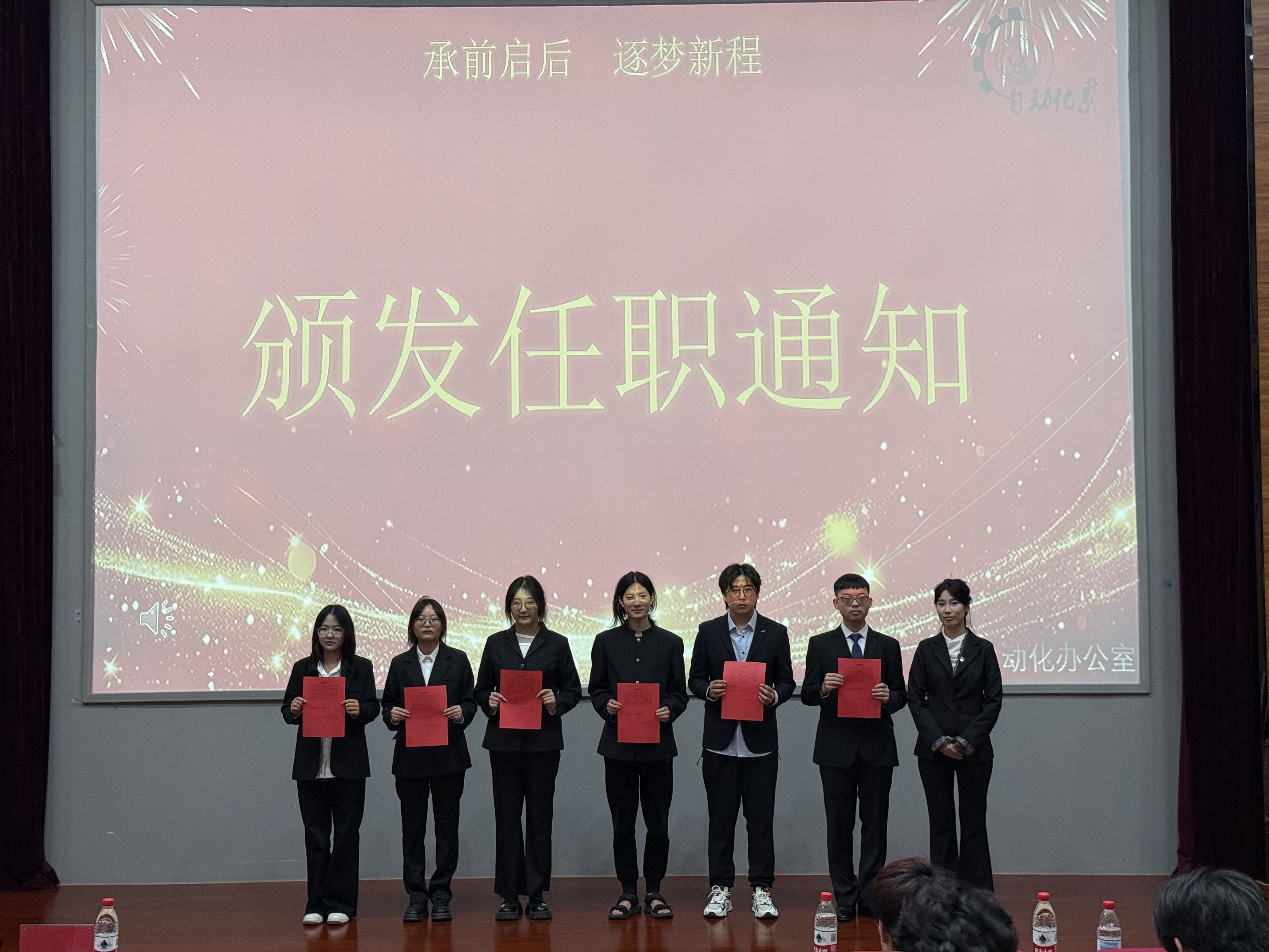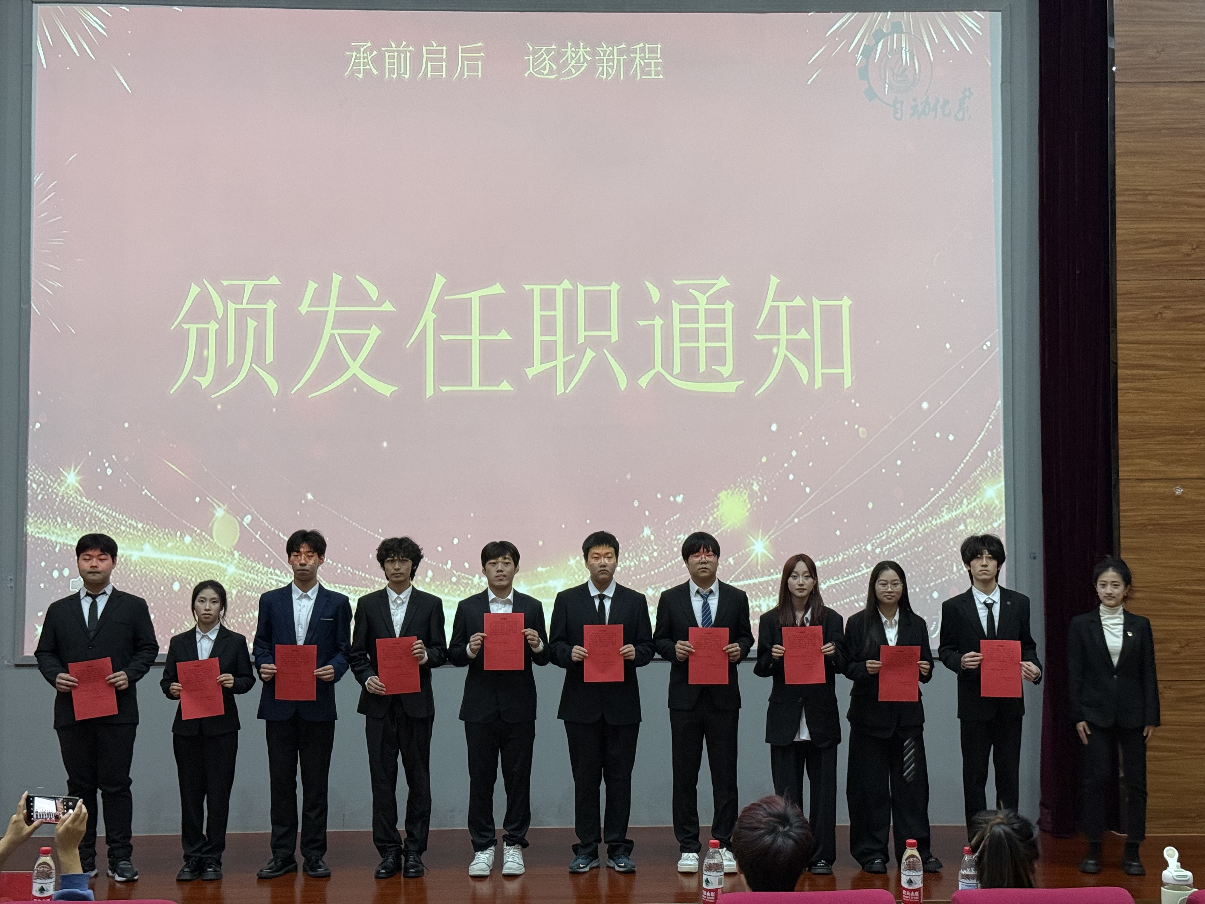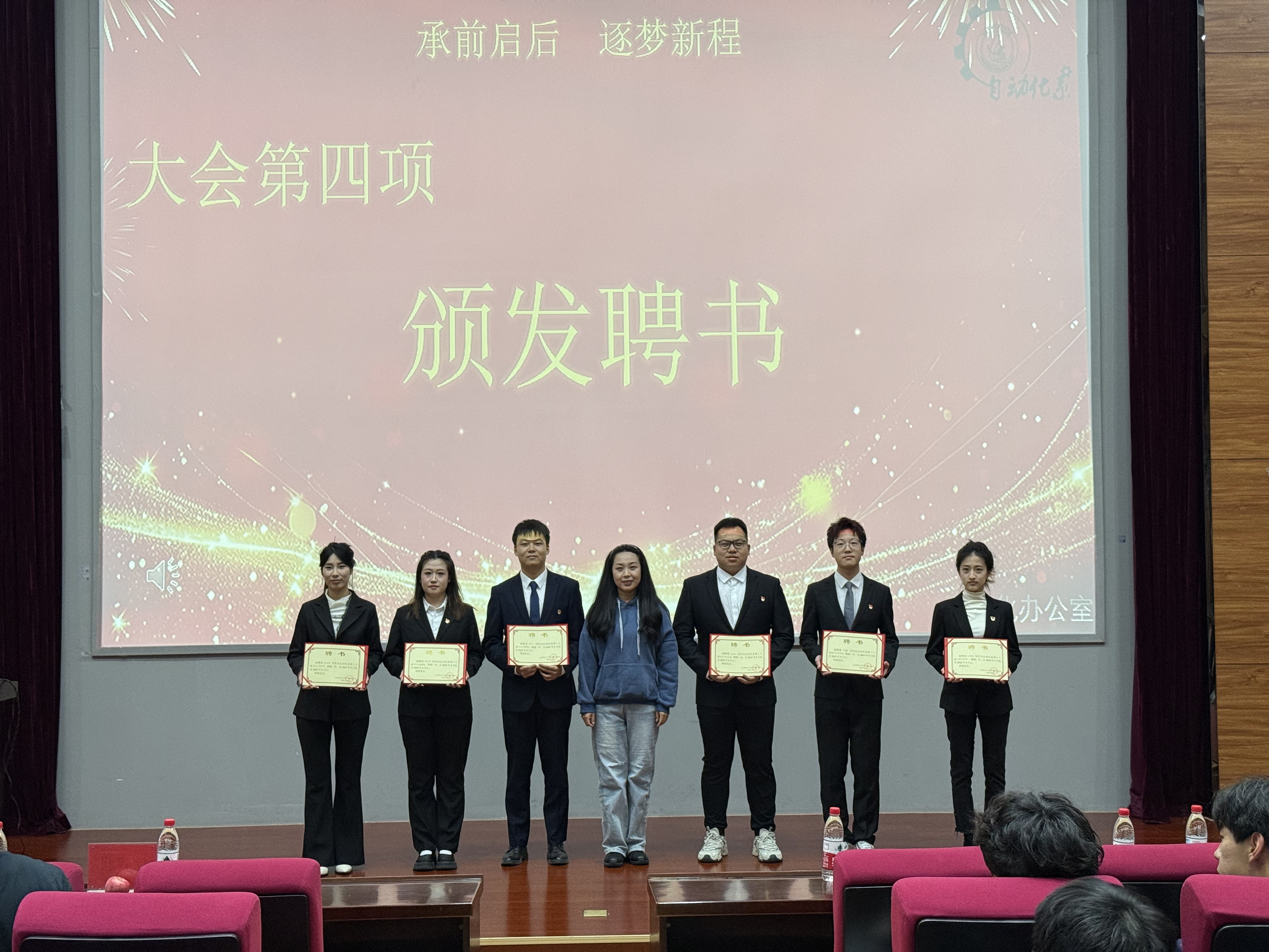 第十九届学生会主席杨丰宁、团总支副书记王梦媛为新一届团学成员颁发任职通知,完成责任与力量的交接。