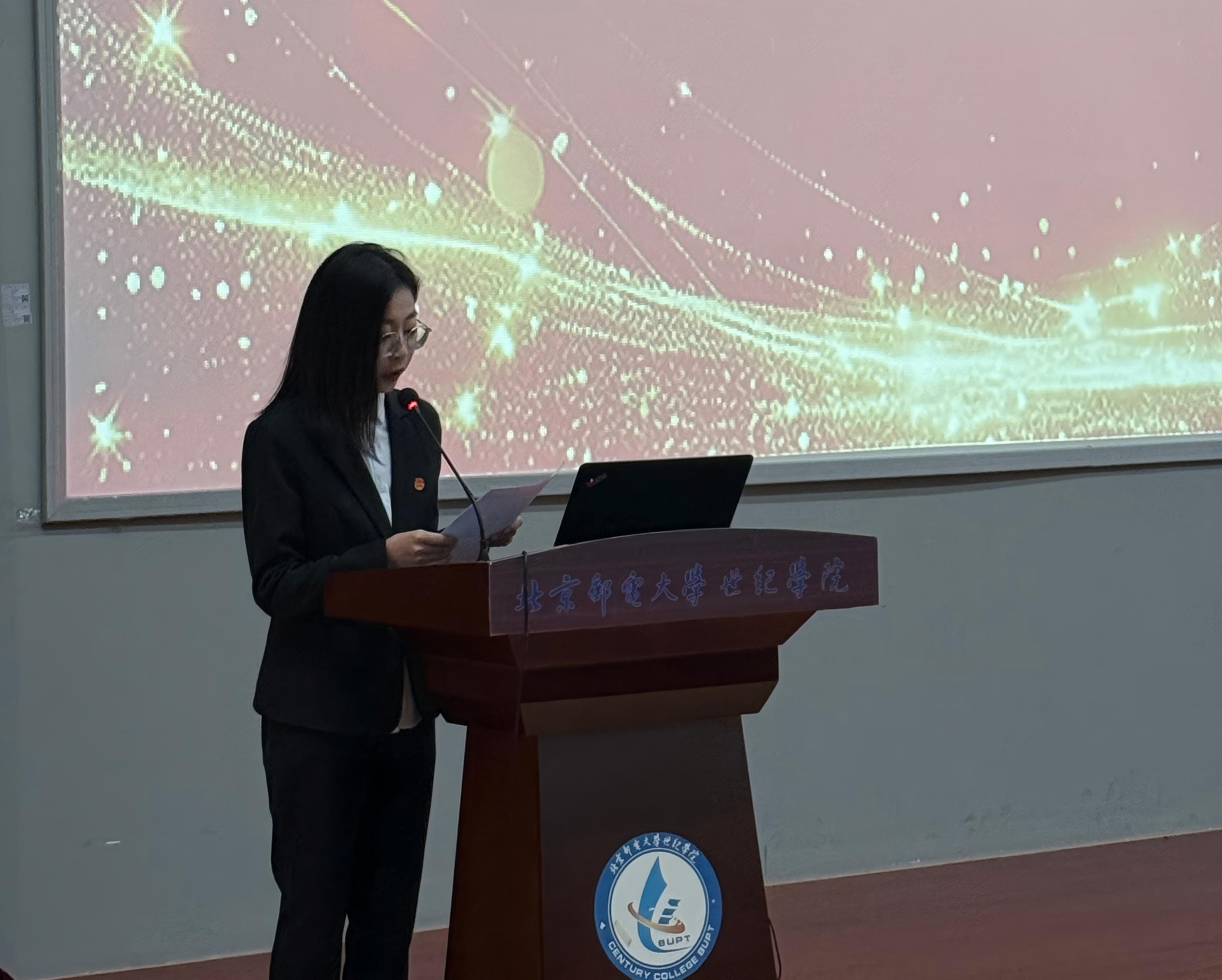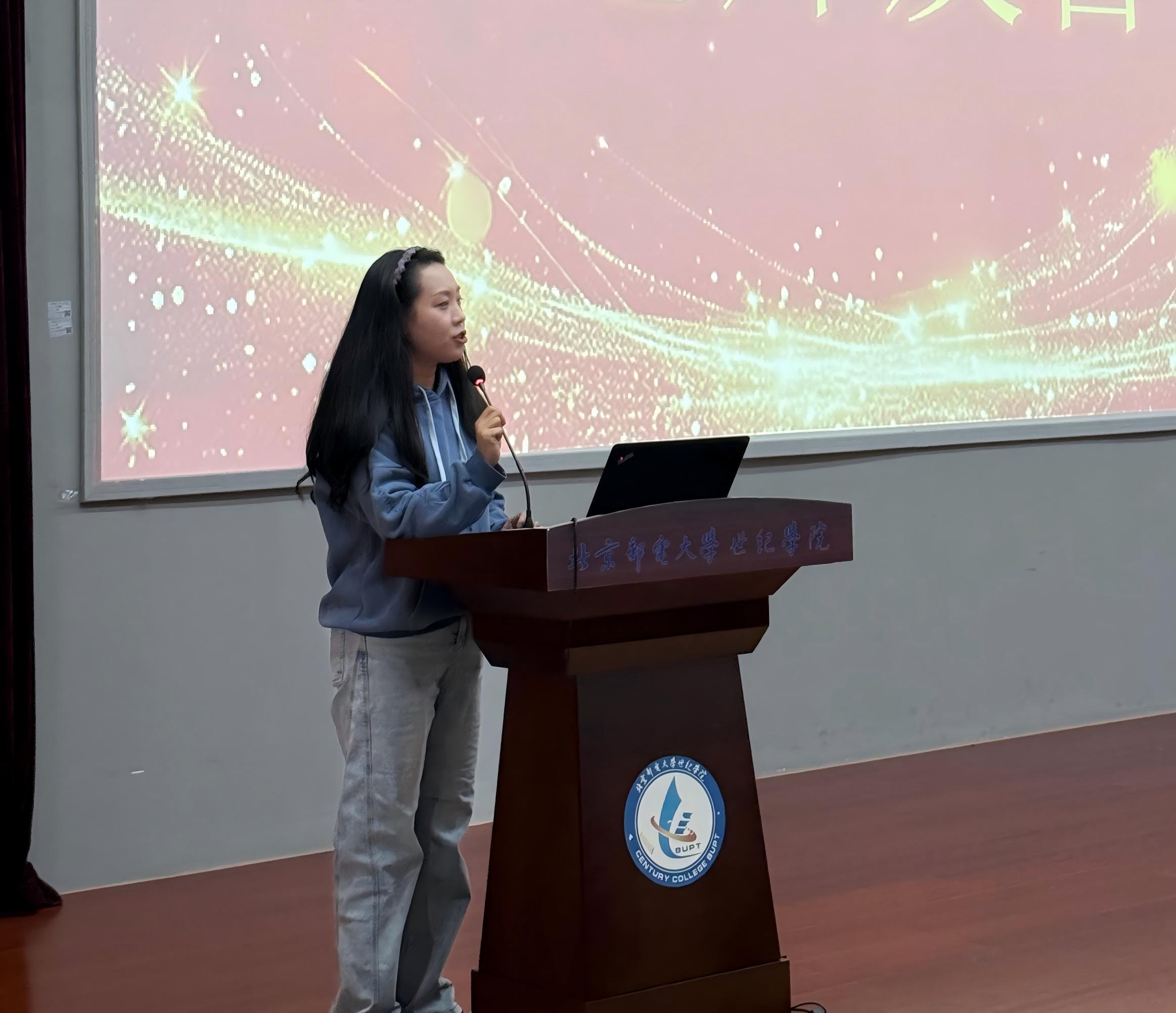 新任团总支副书记戚婷,作为代表上台发言。她向同学们讲述了如何做好工作、提升自己,分享了接下来的工作计划和未来展望,表达了自己的奋进决心。