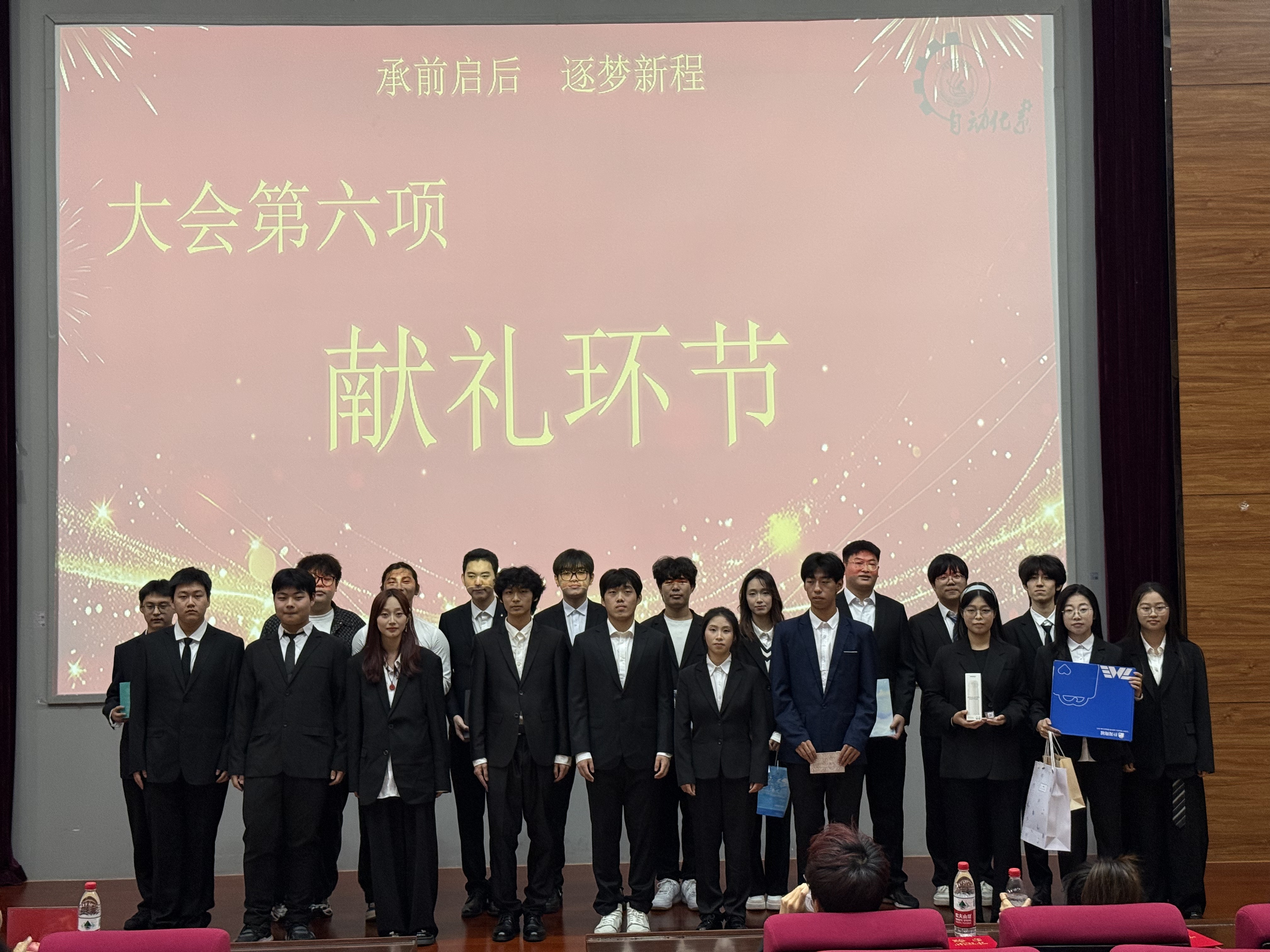 新任团学组织成员向前任成员献礼,温馨庄重的场景象征精神代代相传,让现场满是温情与感动。