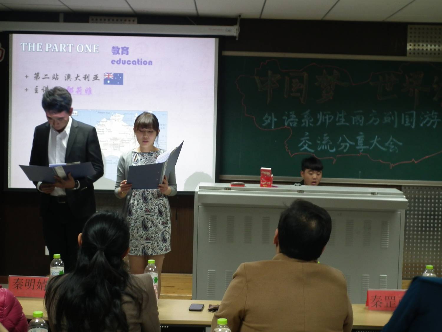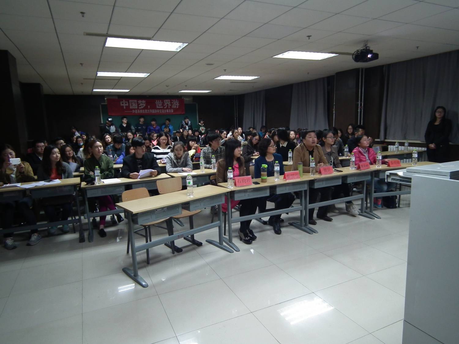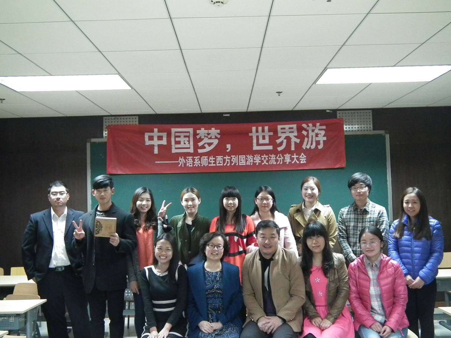 2014年10月21日晚18:00,“中国梦,世界游”外语系师生西方列国游学交流分享大会在明德楼224隆重举行。出席此次大会的嘉宾有外语系副主任秦罡引老师、副主任贺贝老师、外语系教研室石钧岩老师、姚年年老师、辅导员靳丽娜老师、国际交流处秦明婧老师、各系学生会主席以及14、13级外语系全体同学。