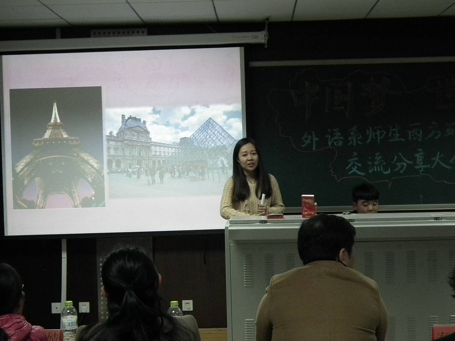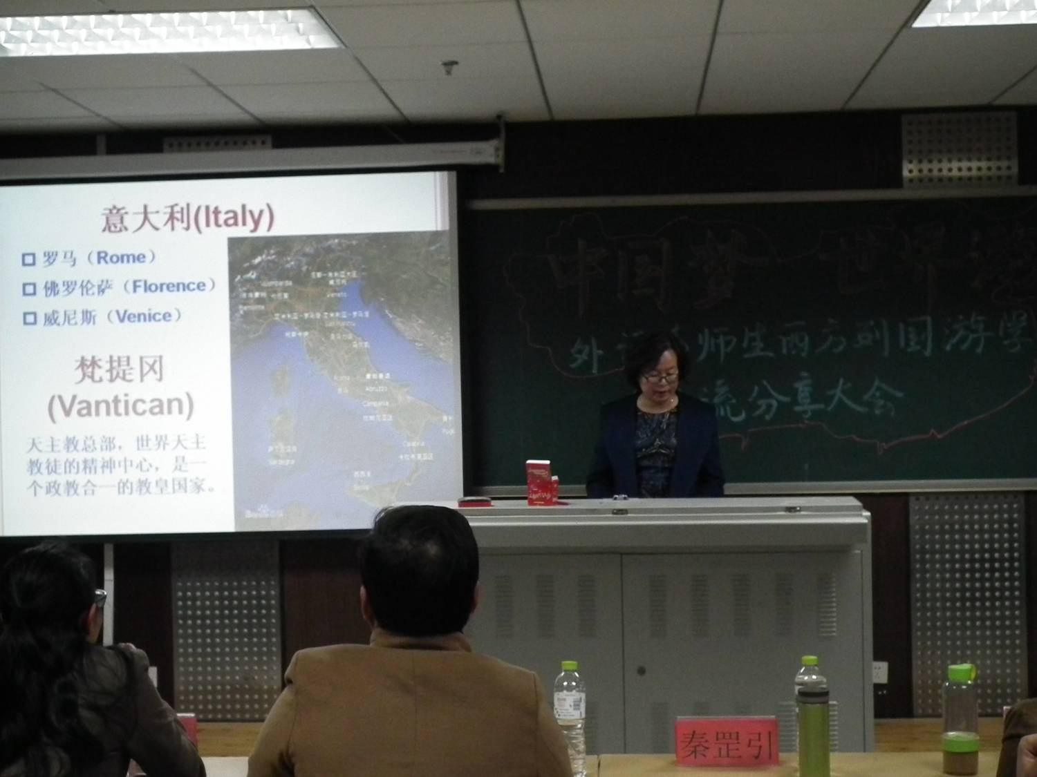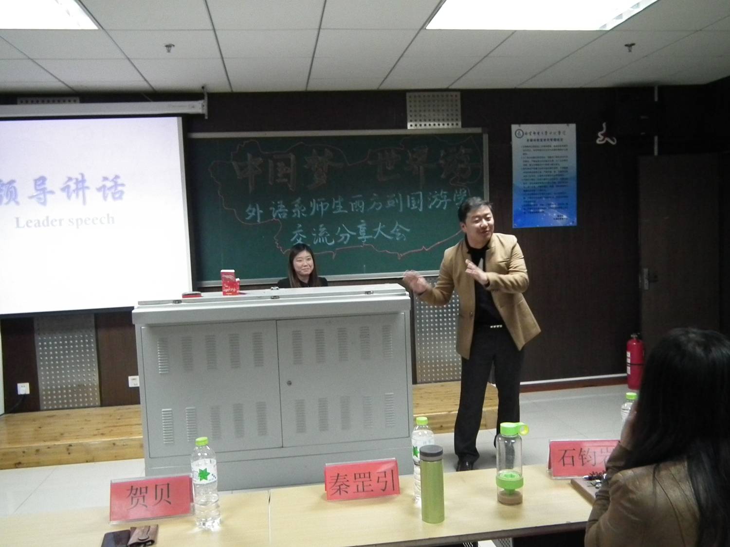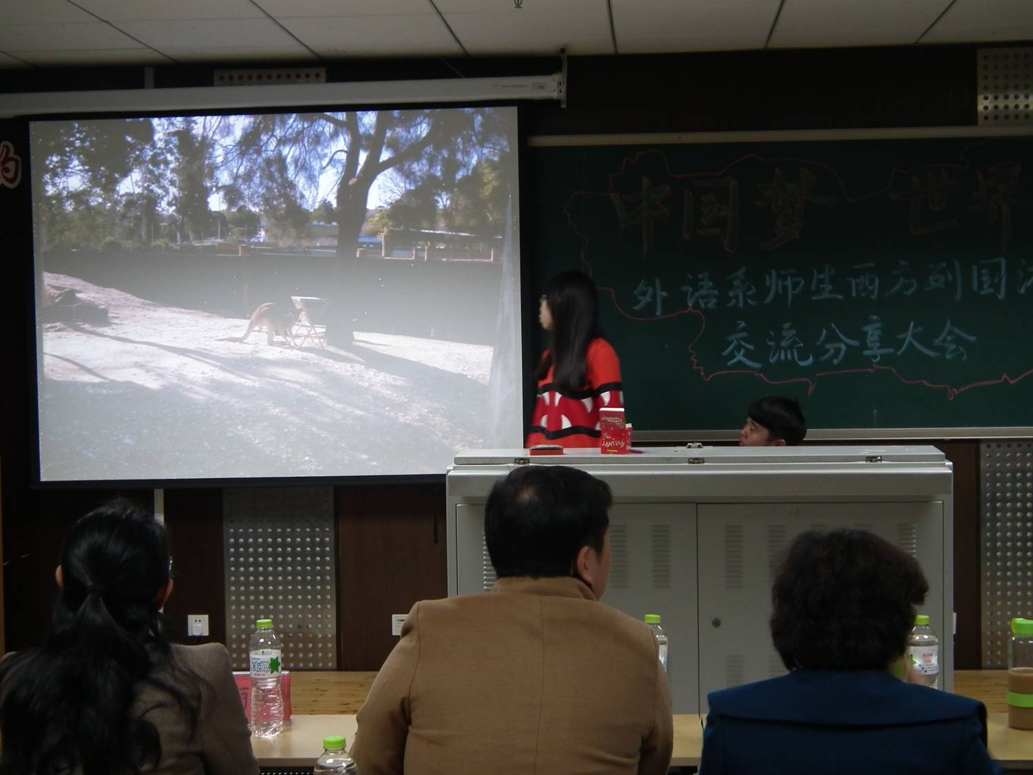 2014年10月21日晚18:00,“中国梦,世界游”外语系师生西方列国游学交流分享大会在明德楼224隆重举行。出席此次大会的嘉宾有外语系副主任秦罡引老师、副主任贺贝老师、外语系教研室石钧岩老师、姚年年老师、辅导员靳丽娜老师、国际交流处秦明婧老师、各系学生会主席以及14、13级外语系全体同学。
